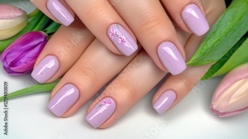 hands showcasing a pearly pastel spring manicure with subtle floral details