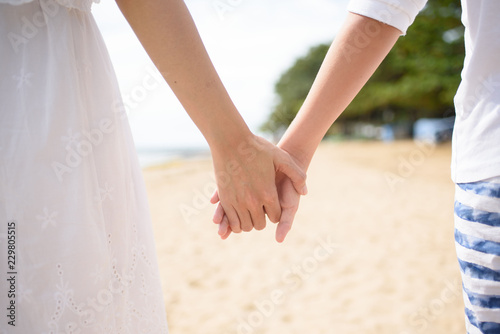 happy family mother with boy walks holding hand on the beach ,white sand beach ,look happy in the summer