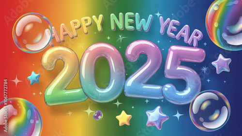 HAPPY NEW YEAR 2025 in bold, colorful letters with a vibrant, colorful and rainbow background