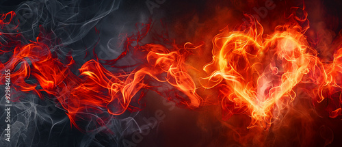 Heart-shaped flames amidst swirling smoke on a dark background. Copy space