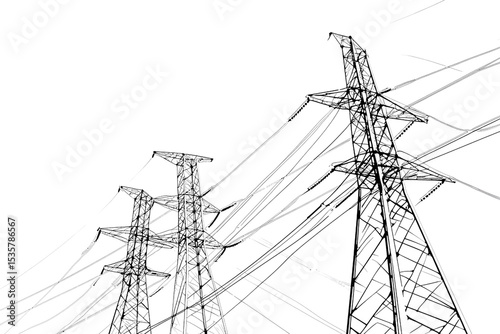 High-voltage power lines, high-voltage towers, lines, white background, vector graphics, simple drawing style, simple lines, black and gray tones, lines drawn with no color,transparent background (3)