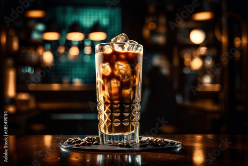 Ice coffee in a tall glass with cream poured over and coffee beans on the bar generative ai