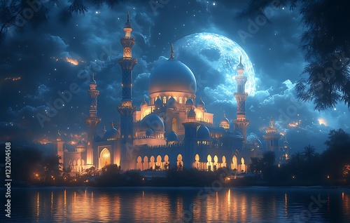 Illuminated Palace by a Lake Under a Night Sky with a Large Moon
