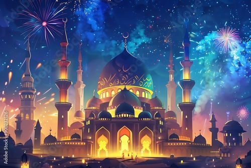 illustration Arabic lantern with burning candle glowing at night Muslim holy month Ramadan.