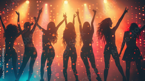 illustration of silhouettes of woman dancing in the nightclub as silhouette in front of party rays