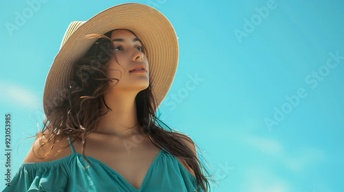 Image of a woman with dark long hair, wearing a green-teal summer dress and a straw hat against the backdrop of a clear blue sky