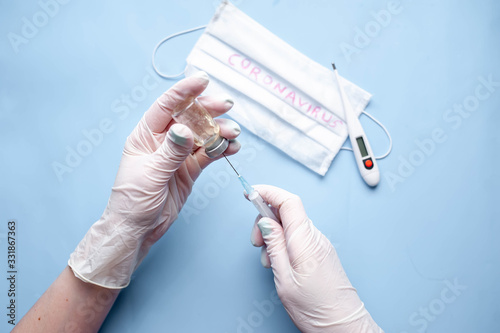 in the hands of the doctor a syringe and an ampoule for administering the medicine, a thermometer for changing the temperature and a protective mask against coronavirusan against a blue background.
