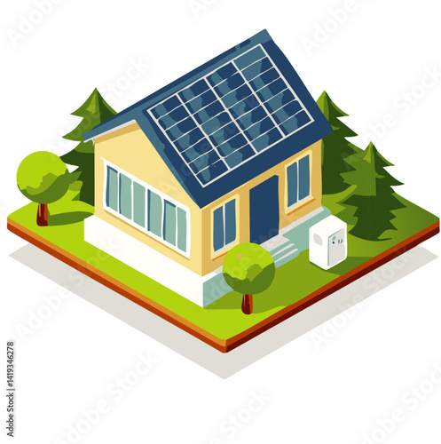 Isometric Eco-Friendly House with Solar Panels and Green Surroundings – Sustainable Living Concept