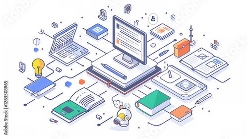 Isometric illustration of digital learning and online education tools