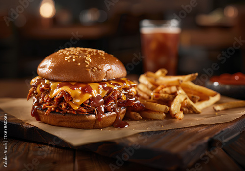 juicy pulled pork sandwich with melted cheddar cheese, drizzled in a smoky-red sauce and served on an artisanal whole-grain bun, alongside fries with rich tomato ketchup
