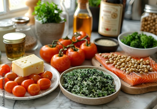 Keto diet concept. Healthy low carbs products. Ketogenic diet food. Vegetables, fish, meat, nuts, seeds, berries, cheese on a white background, top view