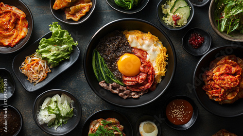 korean bibimbap bowl with fresh vegetables and egg food meat rice dish asian spicy yummy