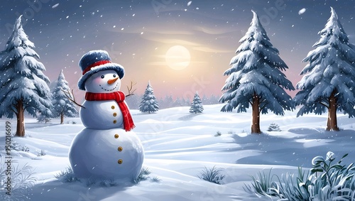 land view with snow trees and beautiful snowman, hd, with snowfall, santa class flying above the clouds