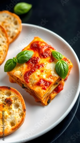 Lasagne served on a white plate with a drizzle of fresh basil and a side of garlic bread