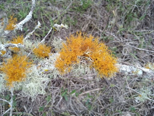 Líquen barba-de-velho (gênero Usnea) com duas cores em galhos de arbusto morto, na Caatinga (Nordeste brasileiro).