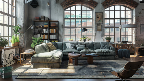 living room with a large window, a brown leather armchair, a dark green sofa, and a wooden coffee table