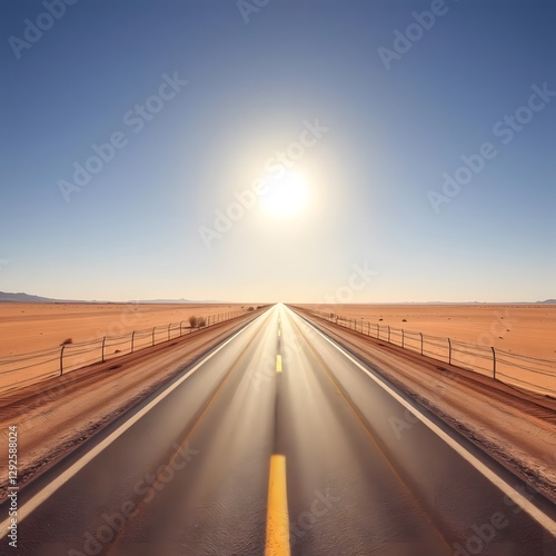 Long Desert Road with Bright Sun and Clear Sky, Heatwaves Rising