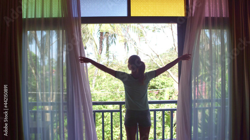 Lovely woman opening colorful curtains and meeting sunrise. View from balcony to jungle.