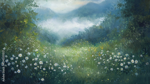 Lush Green Field with White Flowers and Blue Sky