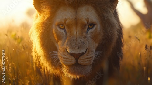 majestic lion in the savanna, strong details, soft background, natural lighting