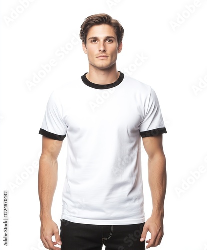 Male Model Wearing a White Ringer T-Shirt with Black Casual Apparel Fashion Shot