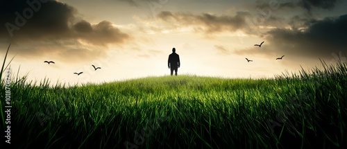 Man atop lush green field, beneath cloudy sky; birds fly above