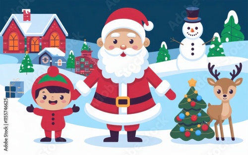 Merry Christmas card with Santa Claus, kids, tree, and deer in snow