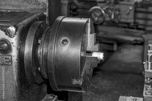 Metalworking workshop, metal processing machines. Vintage Industrial Machinery in a old factory - black and white photo