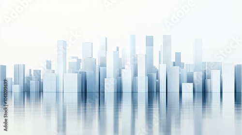 Minimalistic digital city skyline made of geometric squares with blue skyscrapers and reflections in water, set against a white background, symbolizing modern urban design and corporate architecture.