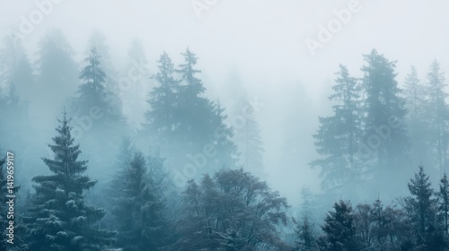Misty forest with tall pines, dense fog, soft light, and ethereal atmosphere