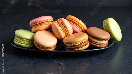Modern minimalism concept Close-up of colorful French dessert for coffee. Multicolored macarons or macaroons on dark or black background.