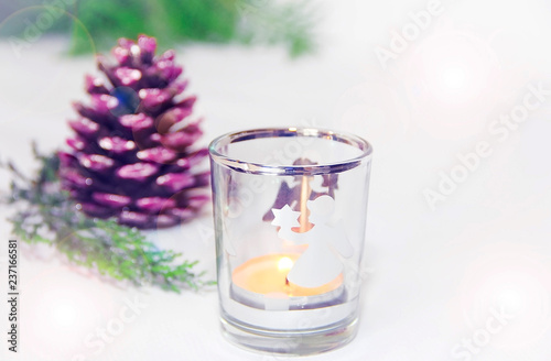 New Year's multicolored decorative shiny cones with a candlestick against the green branches of the Christmas tree