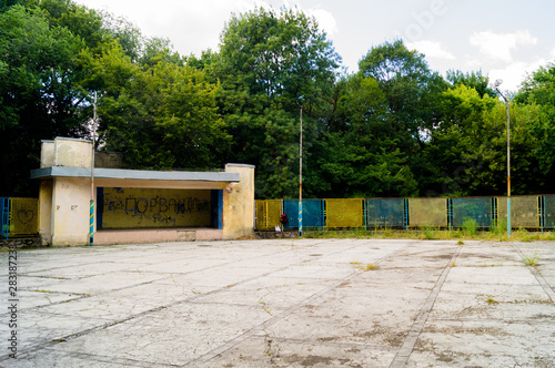 Old floor. Cracks and fractures on the surface. Grass grows through concrete.