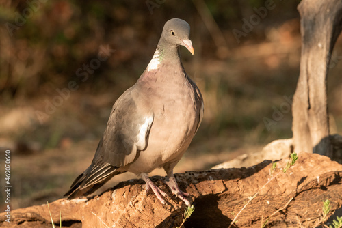 paloma torcaz posada en el suelo del bosque mediterráneo (Columba palumbus)