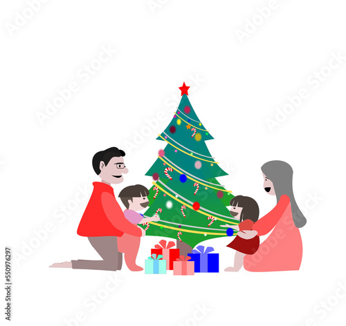 Parents and children help decorate the Christmas tree.family and happy new year concept.illusatration on isalate white background.