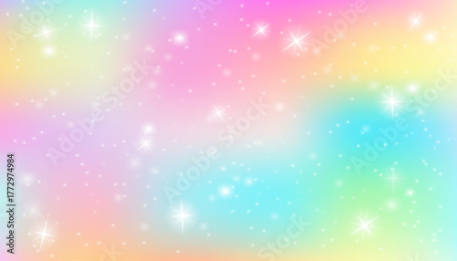 Pastel rainbow hologram with magical unicorn vibe. Iridescent pink and purple gradient background with sparkles, kawaii dreamy sky, fantasy vector texture for holiday, party and celebration decor