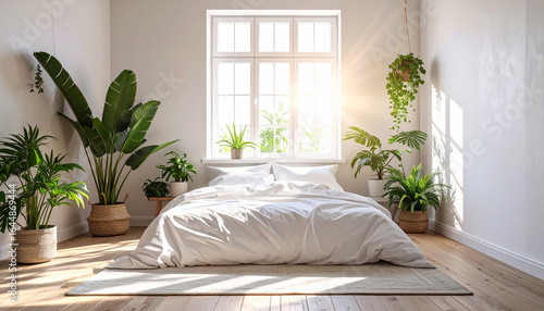 Peaceful Morning with Sunlight on Bed and Green Plants