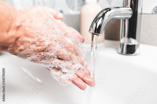 Person washing their hands with soap and hot water in the home sink wash. Cleaning the hygiene of the hand to prevent outbreaks of coronavirus.