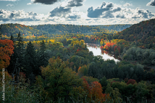 Picturesque view on valley of Gaujas national park. Trees changing colors in foothills. Colorful Autumn day at city Sigulda in Latvia.