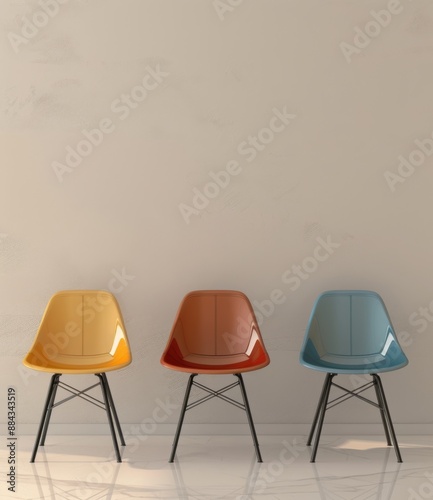 plastic chairs of different colors arranged in front of each other against the wall, minimalist interior design with neutral tones and a symmetrical composition.