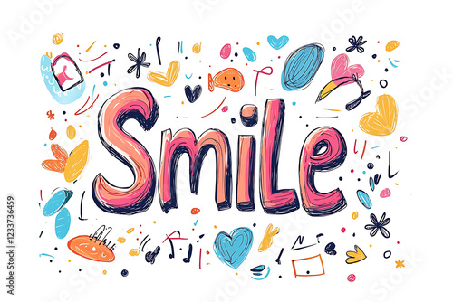playful hand-drawn illustration of the word "Smile" in vibrant colors with artistic brushstrokes on a clean white background.
