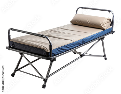 Portable Folding Cot with Taut Fabric Surface and Metal Frame, Side Profile View, Isolated PNG
