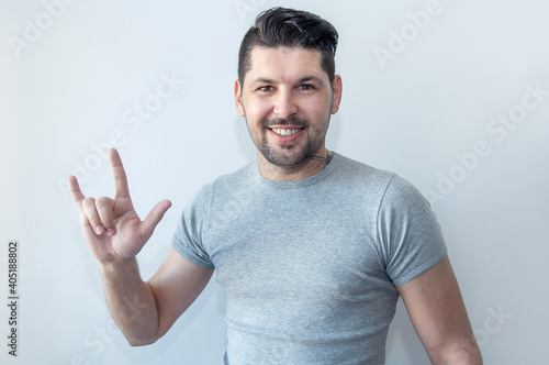 Portrait of a happy young man having fun and showing horns hand gesture. Depicting heavy metal rock sign.