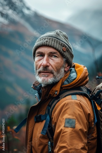 portrait of a middle-aged man exploring the great outdoors, dressed for hiking and surrounded by panoramic mountain views, capturing the spirit of outdoor recreation and personal achievement.