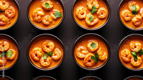 Portuguese shrimp curry bowls with fresh herbs, vibrant seafood cuisine, appetizing main course presentation