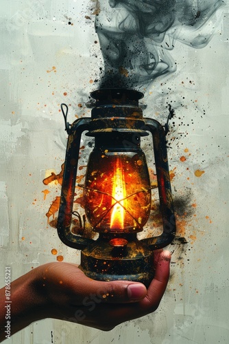 Poster, ink pen, polygon, black, smoke coming, book illustration, a hand holding, lantern, camping book, blots, minimalistic