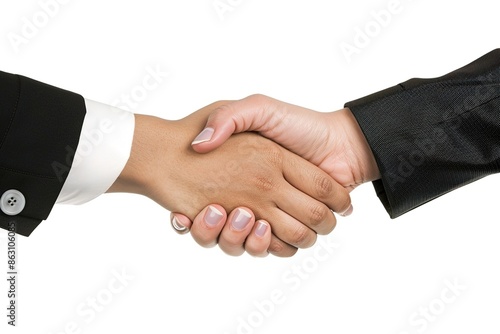 Professional people in suits shaking hands after a successful interview in a well-lit modern office. Business partnership, job interview, and professional agreement concepts on a white background