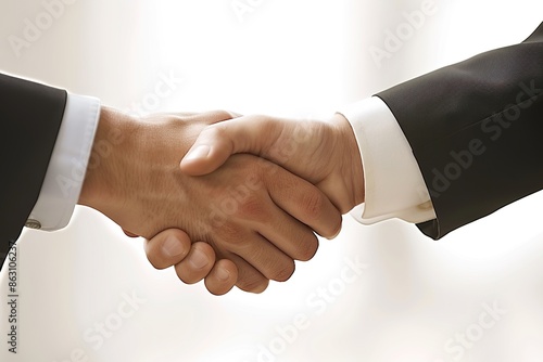 Professional people in suits shaking hands after a successful interview in a well-lit modern office. Business partnership, job interview, and professional agreement concepts on a white background