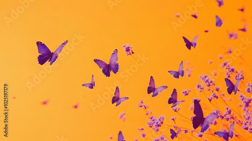Purple butterflies flying over lavender field, orange background with yellow sky