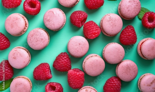 raspberry macaroons and raspberries on a green surface. generative ai